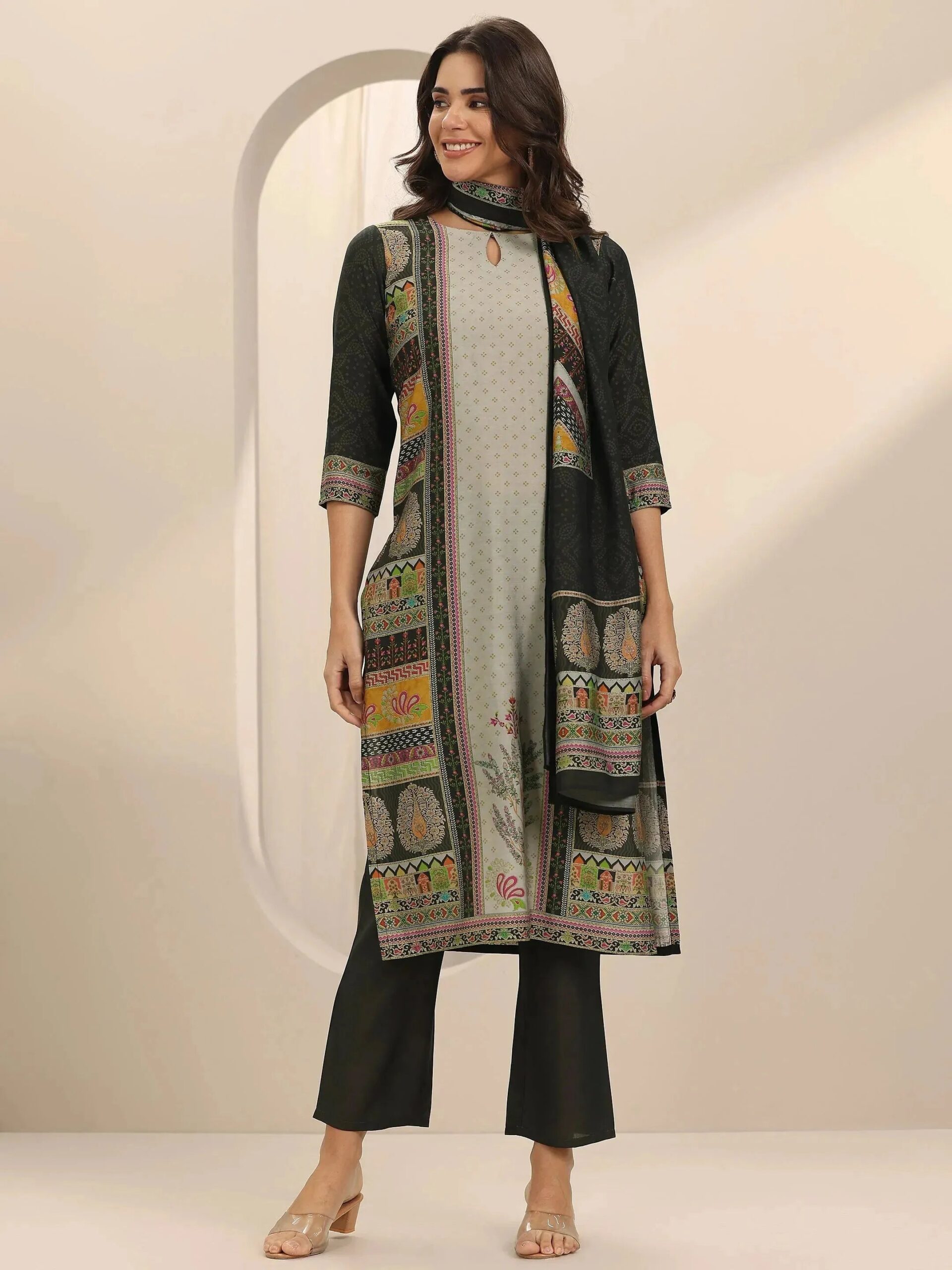 Grey Printed Silk Blend Straight Suit Suite