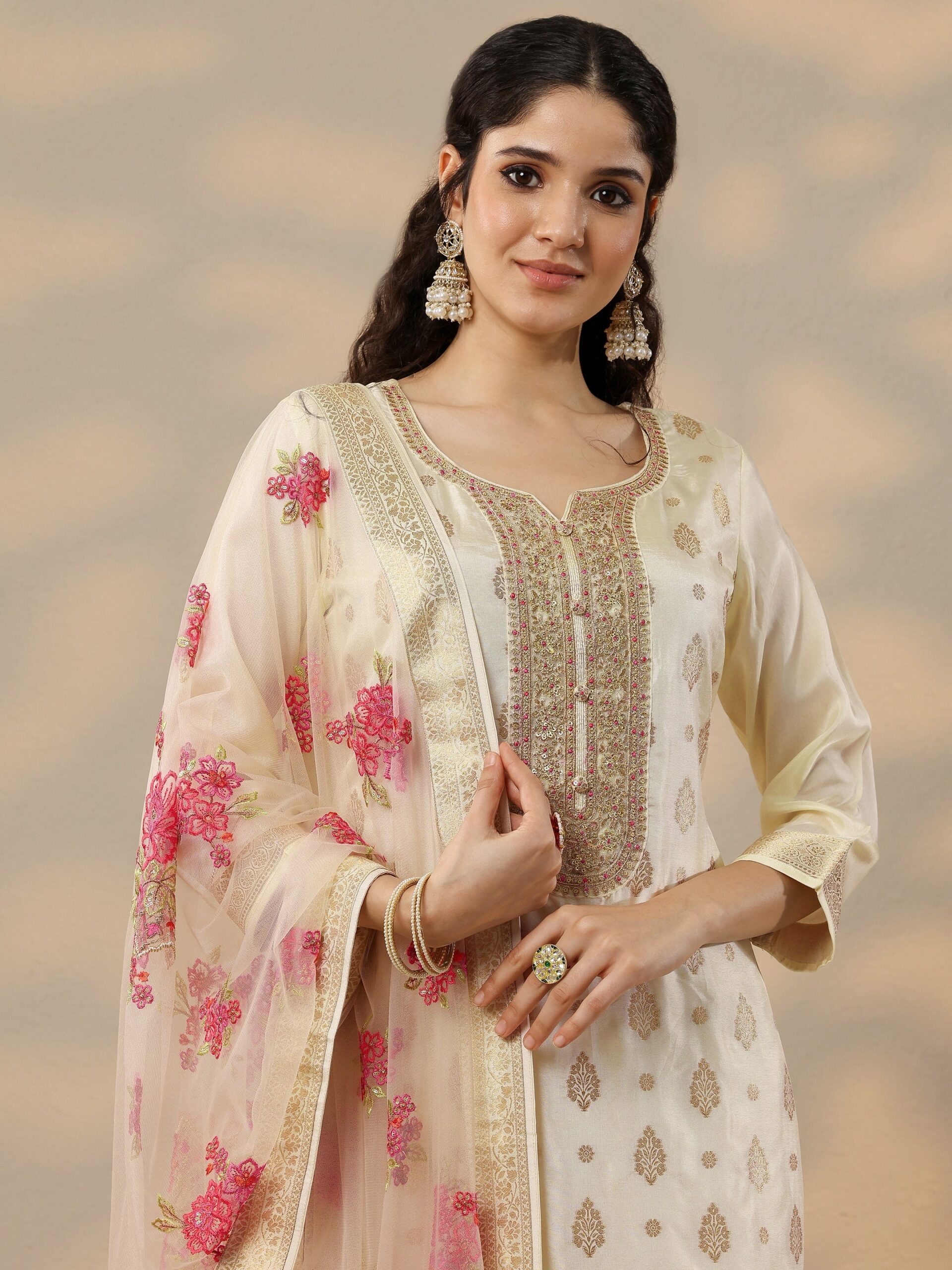 Off White Woven Design Silk Blend straight