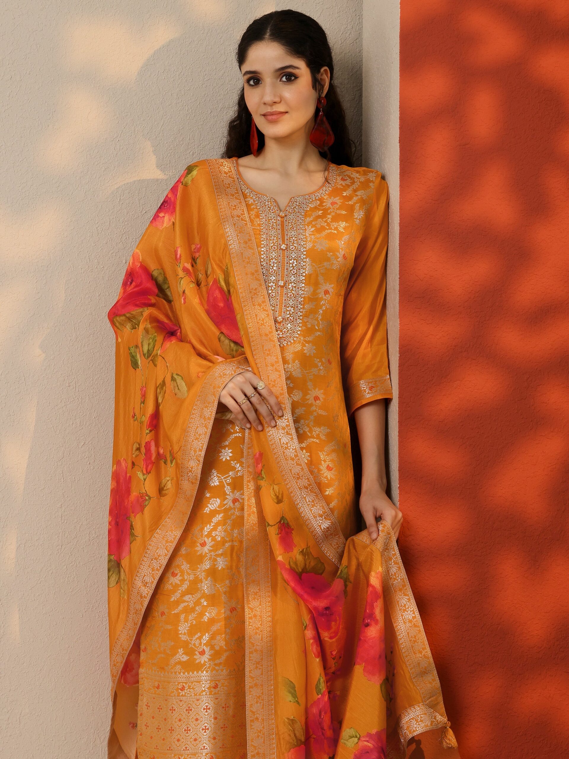 Orange Woven Design Silk Blend Straight